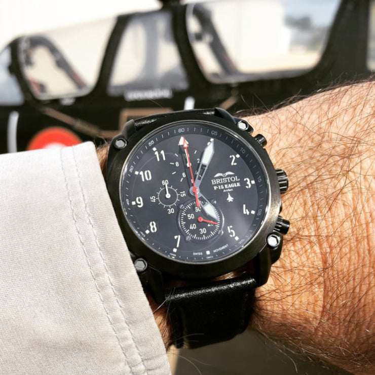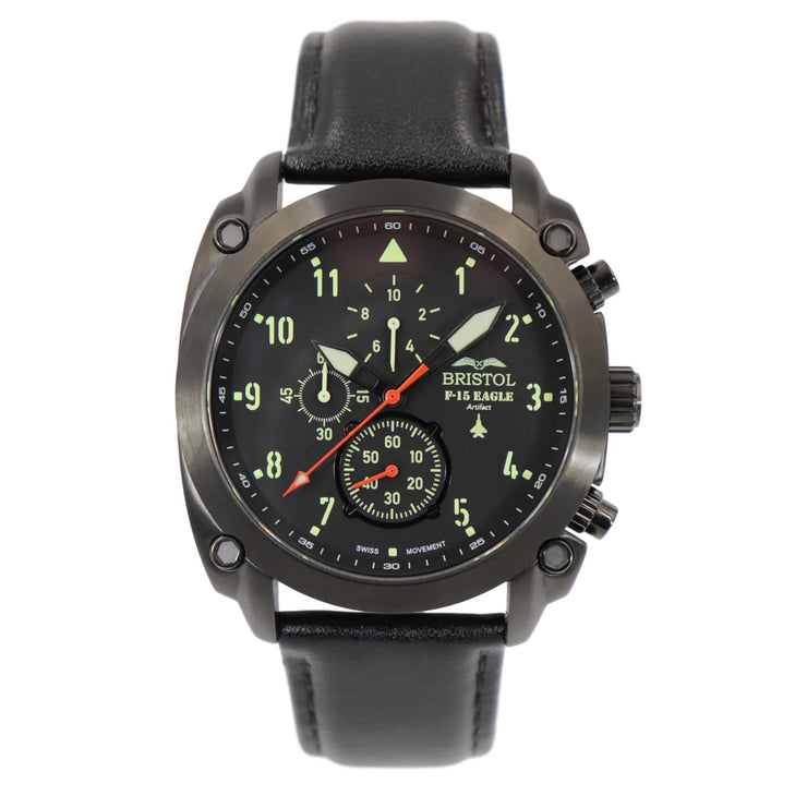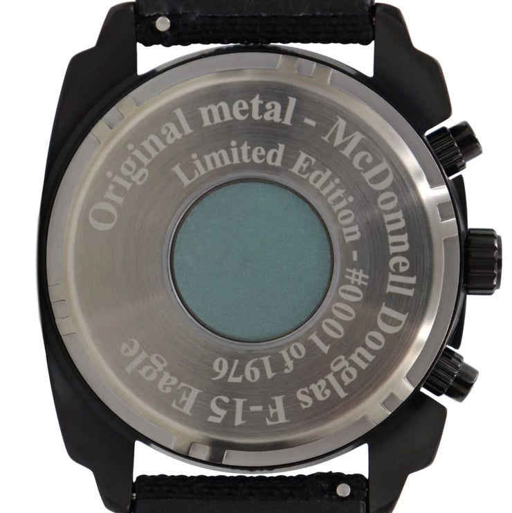 The F-15 Eagle is the most dominant air superiority fighter aircraft in history. WIth a kill ratio of 102 kills to 0 losses. Feared by enemies, it remains able to dominate any airspace it occupies. A precision machined stainless steel case displays an original artifact from an F-15 Eagle airframe. The movement is a precision Swiss made chronograph with a Super Luminova dial protected by a scratch-resistant sapphire crystal. This design is limited to 1976 units in honor of the year the Eagle entered service.