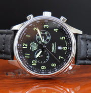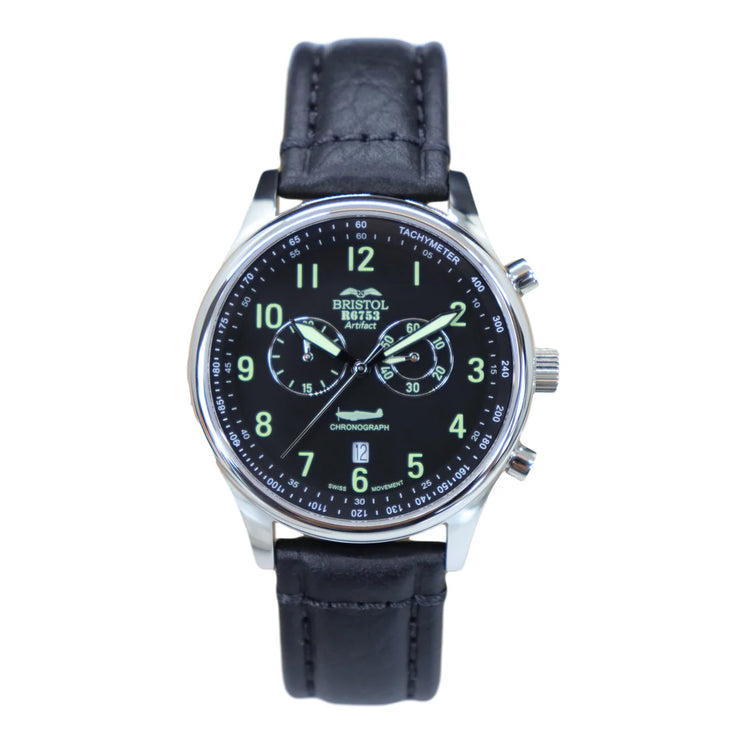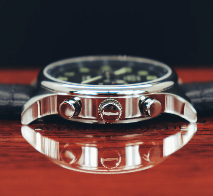 The Supermarine Spitfire is arguably the most iconic and beautiful fighter plane of World War II. An aircraft that will be forever associated with the epic Battle of Britain which raged in the skies over England in 1940. This classic aviator design uses a precision Swiss made chronograph with a Super Luminova dial protected by a scratch-resistant sapphire crystal. This design is limited to 1940 units in honor of the Battle of Britain, with the case back displaying original airframe material from Spitfire R6753. Pilot JC Pinckney shot down an ME-109 on Aug 29, 1940 while at the controls of R6753.